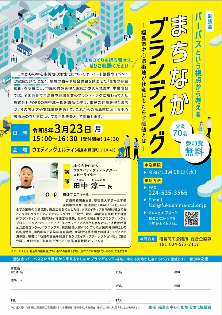 3月23日(月)に田中淳一が福島商工会議所の福島市中心市街地活性化協議会主催のまちづくり勉強会にて講師を務めます。社会的存在意義とは何かを明確にし、ブランディングに繋げる「パーパスブランディング」の視点を通して、これからの福島市中心市街地のまちづくりについて考える内容となっています。
